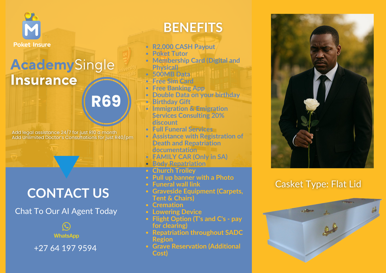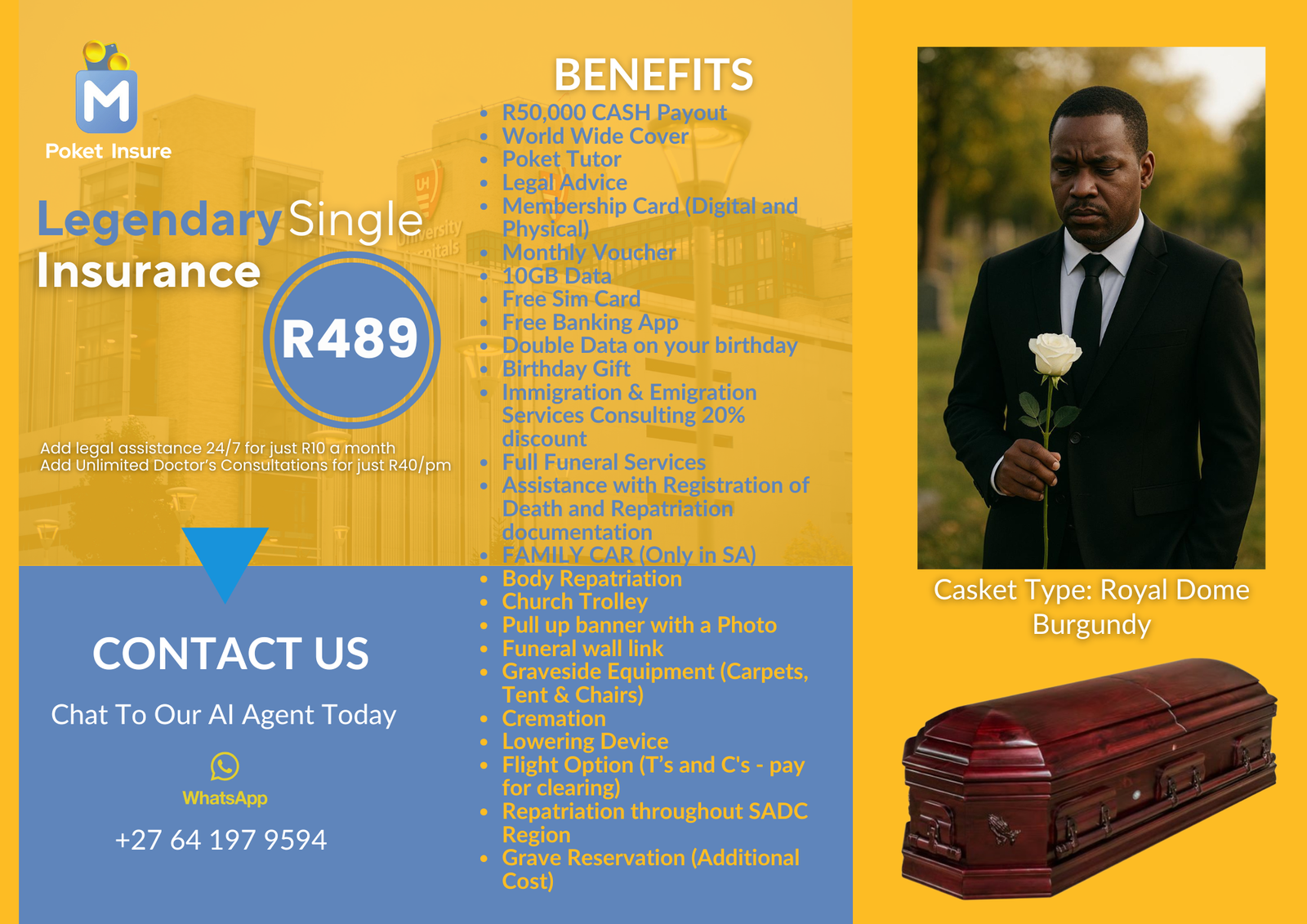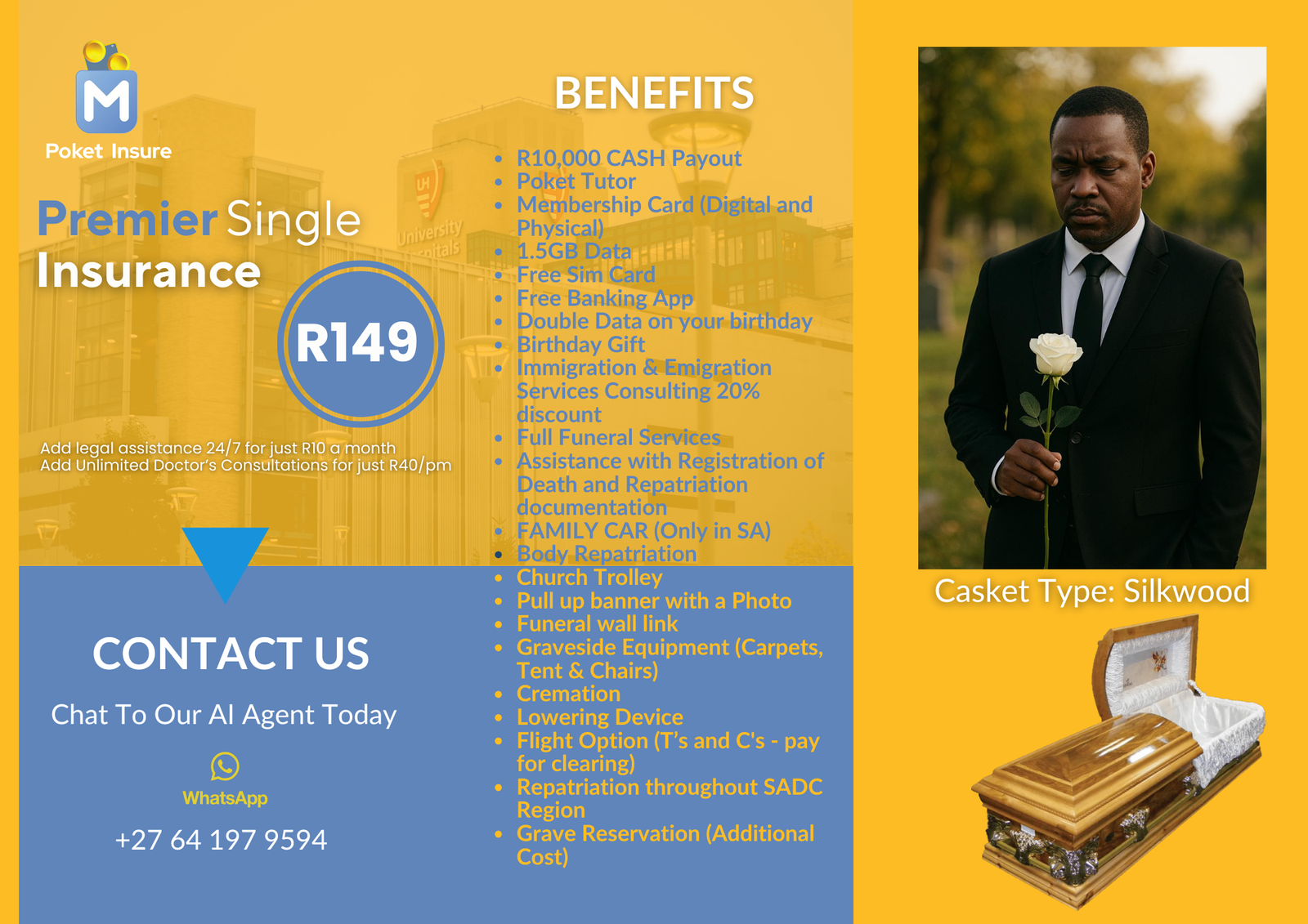 Includes full funeral cover, unlimited doctor consultations, up to 10GB mobile data, R1 000 interest-free advance, grocery savings, and full Poket Tutor access.