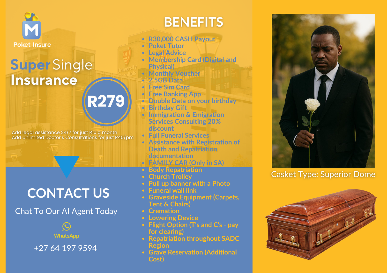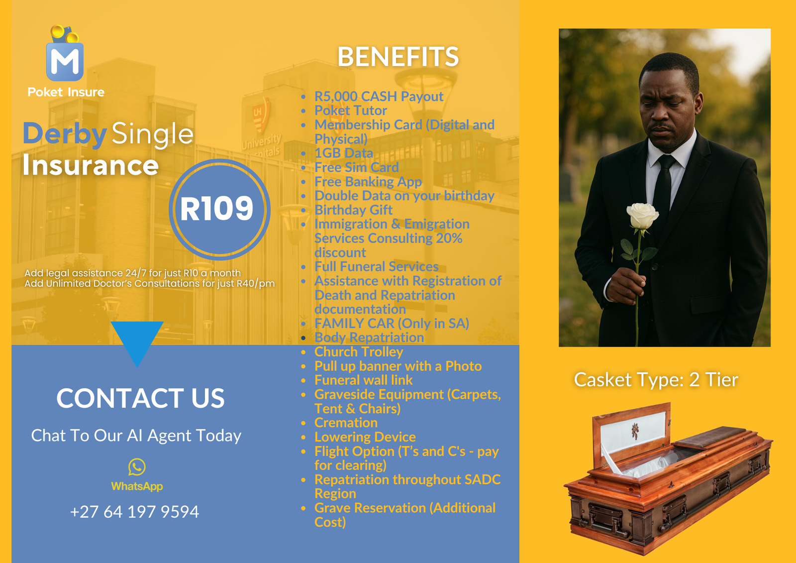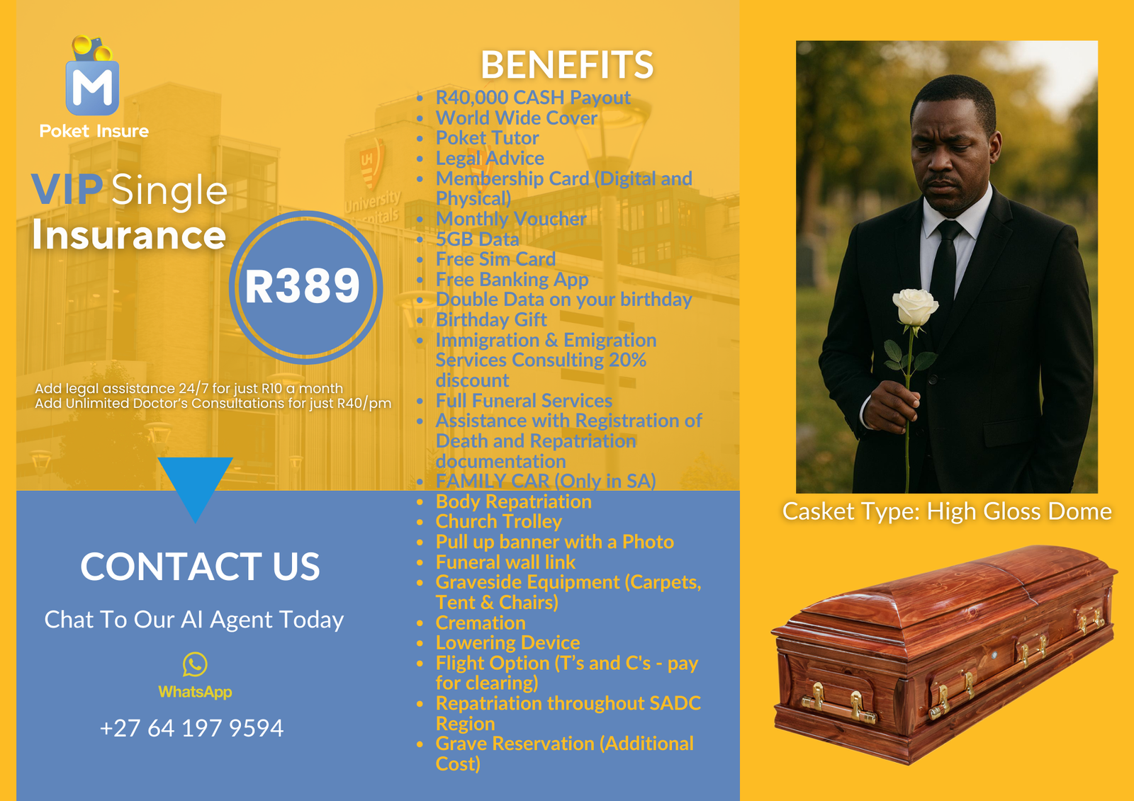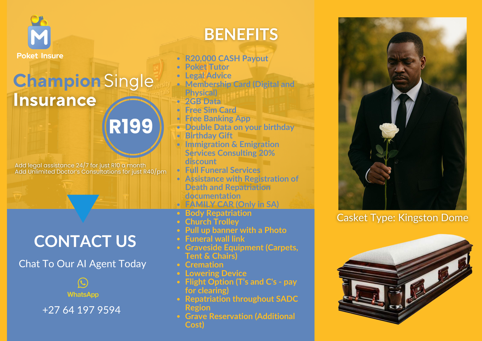 Includes full funeral cover, unlimited doctor consultations, up to 10GB mobile data, R1 000 interest-free advance, grocery savings, and full Poket Tutor access.